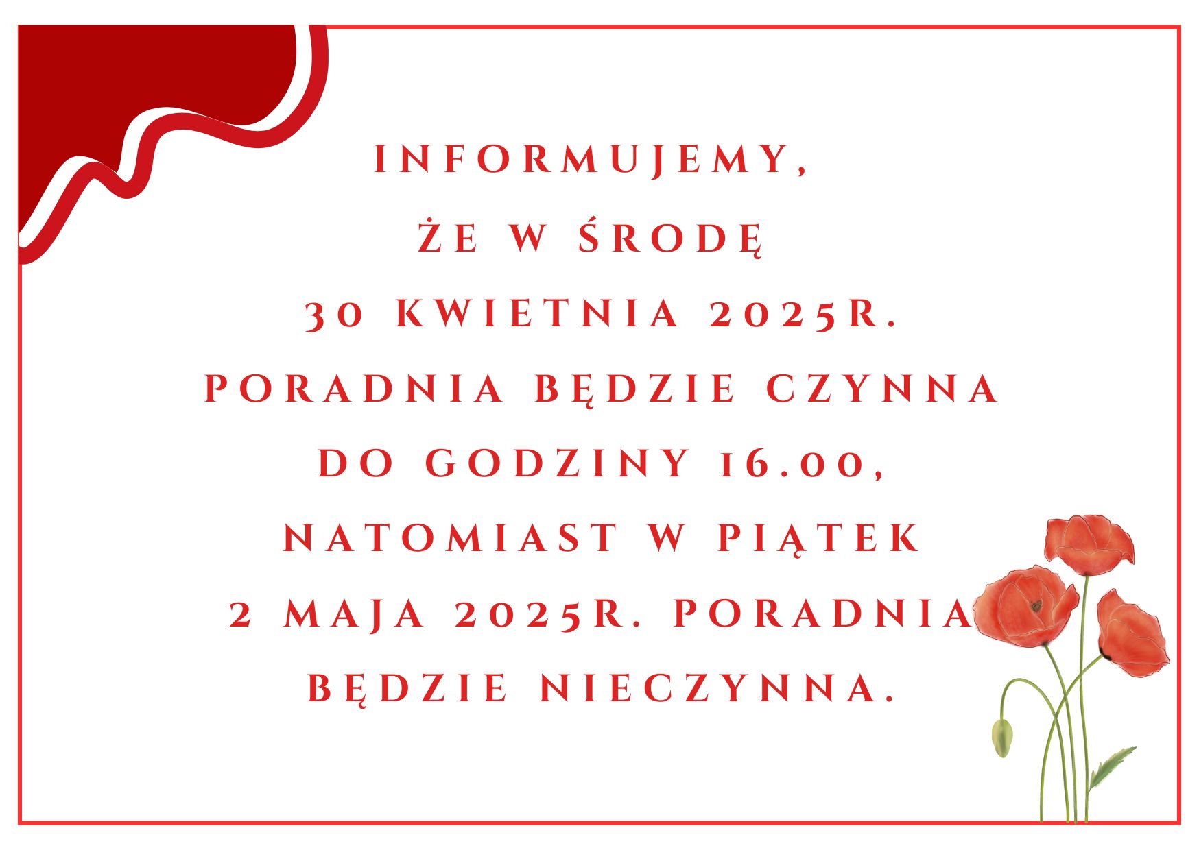 Weronika Zielińska   29 kwietnia 2025   Brak komentarzy do Informacja o zmianach organizacji pracy w poradni